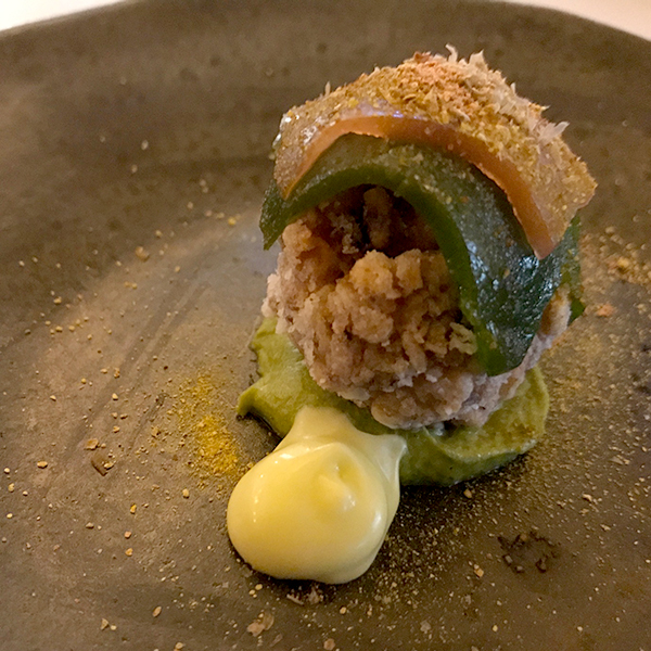 prvi slijed, od sedam, donosi patlidjan sa domaćim jogurtom i hrskavom kožicom istog patlidjana, vrlo interesantno, ukusno, puno prikrivenih nijansi..