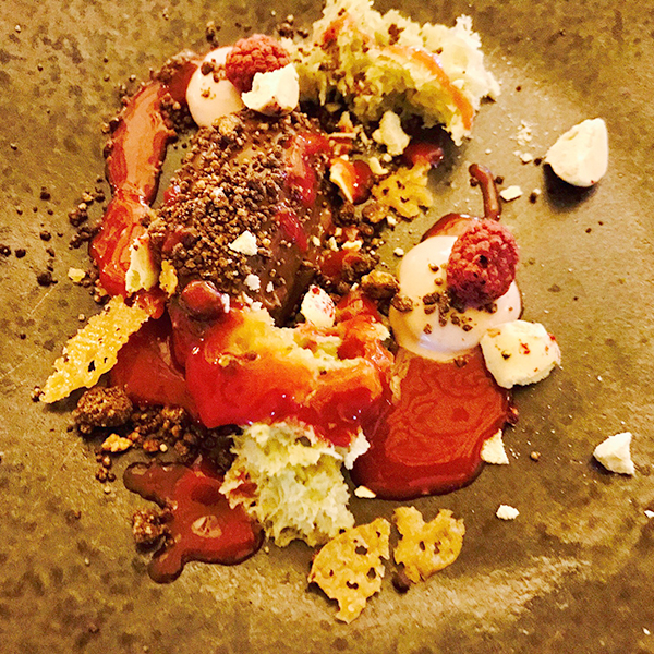 desert, ponovno malo remekdjelo vizualne prezentacije. primjereni kraj večere, čokolada, maline u više agregatnih stanja, spužvice….i na kraju još i jedan mali macaron