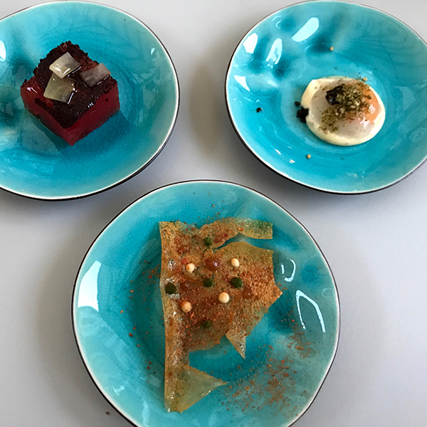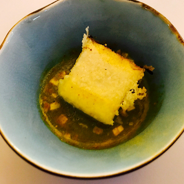 treći slijed, hrskavi krakovi sipe, mala čvrsta kuglica prekrivena sa dva različita želea, eksplozija okusa na nepcu, jako fino i efektno jelo.