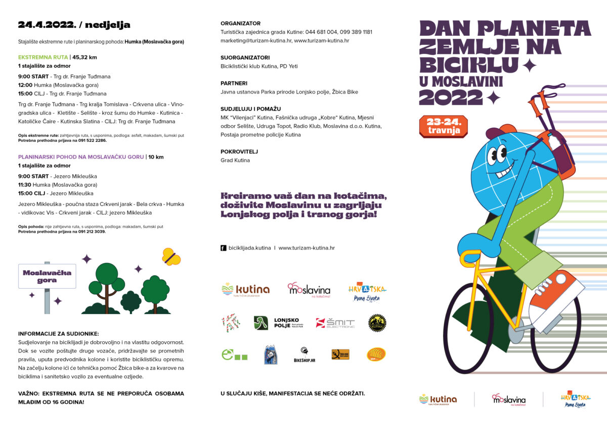 Dan planeta Zemlje službeno se obilježava u više od 150 zemalja diljem svijeta, a u Kutini će se obilježiti 23. i 24. travnja ekološko-rekreativnom biciklijadom i planinarskim pohodom pod nazivom „Dan planeta Zemlje na biciklu u Moslavini“. Već tradicionalna biciklijada, jedna od najvećih u zemlji, pruža ugodnu vožnju prekrasnim moslavačkim krajem na tri rute tijekom dva dana uz Planinarski pohod na Moslavačku goru. Biciklijada nudi izvrsno druženje i ugodnu vožnju okolicom Kutine te razvija cikloturističku ponudu regije, a ove godine će se sudionici moći priključiti i Planinarskom pohodu te upoznati ljepotu Moslavačke gore.