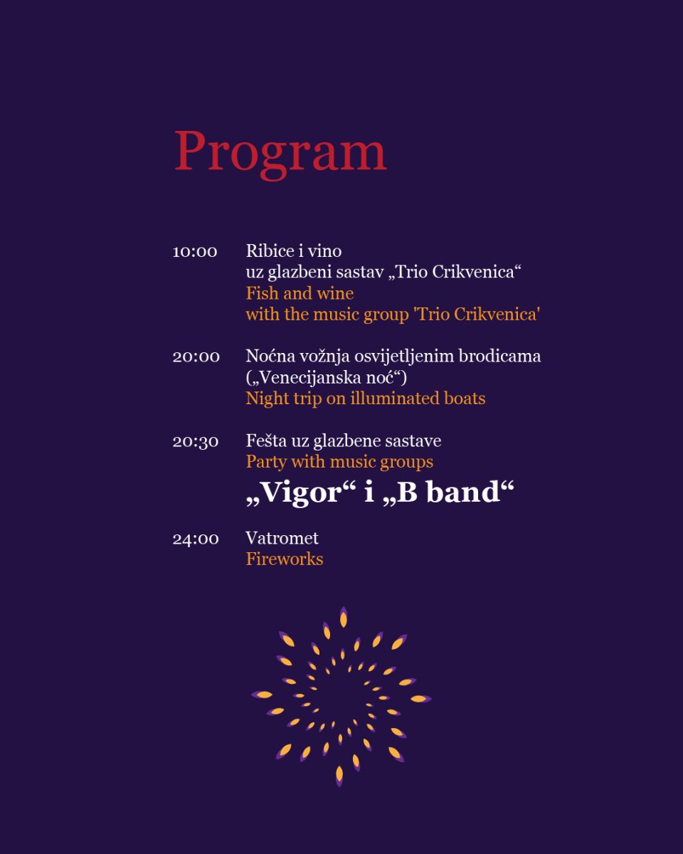 Prema već desetljećima uhodanom rasporedu, selački ribari, vrijedni članovi ribolovnoga društva “Oslić”, imat će istaknutu ulogu. Već će od 10 sati na rivi marljivo peći i nuditi besplatne ribice, začinjene domaćim vinom i primorskom pjesmom kojom će nas uveseljavati „Trio Crikvenica“.
