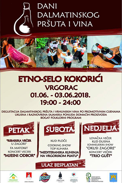 Trodnevni eno-gastro festival „Dani Dalmatinskog pršuta i vina“ treću će se godinu održati u ruralnom ambijentu Etno sela Kokorići od petka 1. lipnja do nedjelje 3. lipnja u organizaciji Turističke zajednice grada Vrgorca te pod pokroviteljstvom Ministarstva poljoprivrede RH i Ministarstva gospodarstva, poduzetništva i obrta RH.