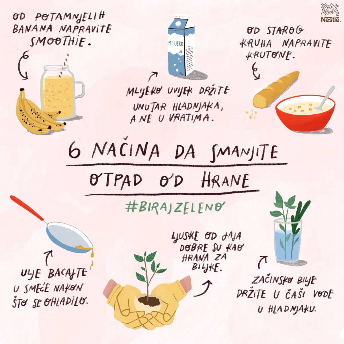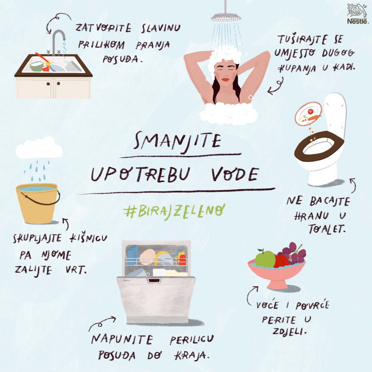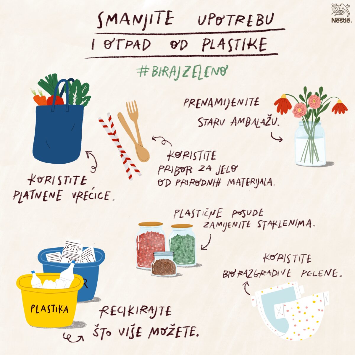 Građani iz svih krajeva Hrvatske, svojim su savjetima za održiviju svakodnevicu sudjelovali u Nestlé inicijativi Biraj Zeleno. Najkorisnije od njih, poznata ilustratorica Maja Tomljanović objedinila je u tri jedinstvene infografike. Svaka prikazuje po šest održivih preporuka s fokusom na smanjenje upotrebe vode i plastike te smanjenje otpada, s posebnim naglaskom na otpad od hrane.