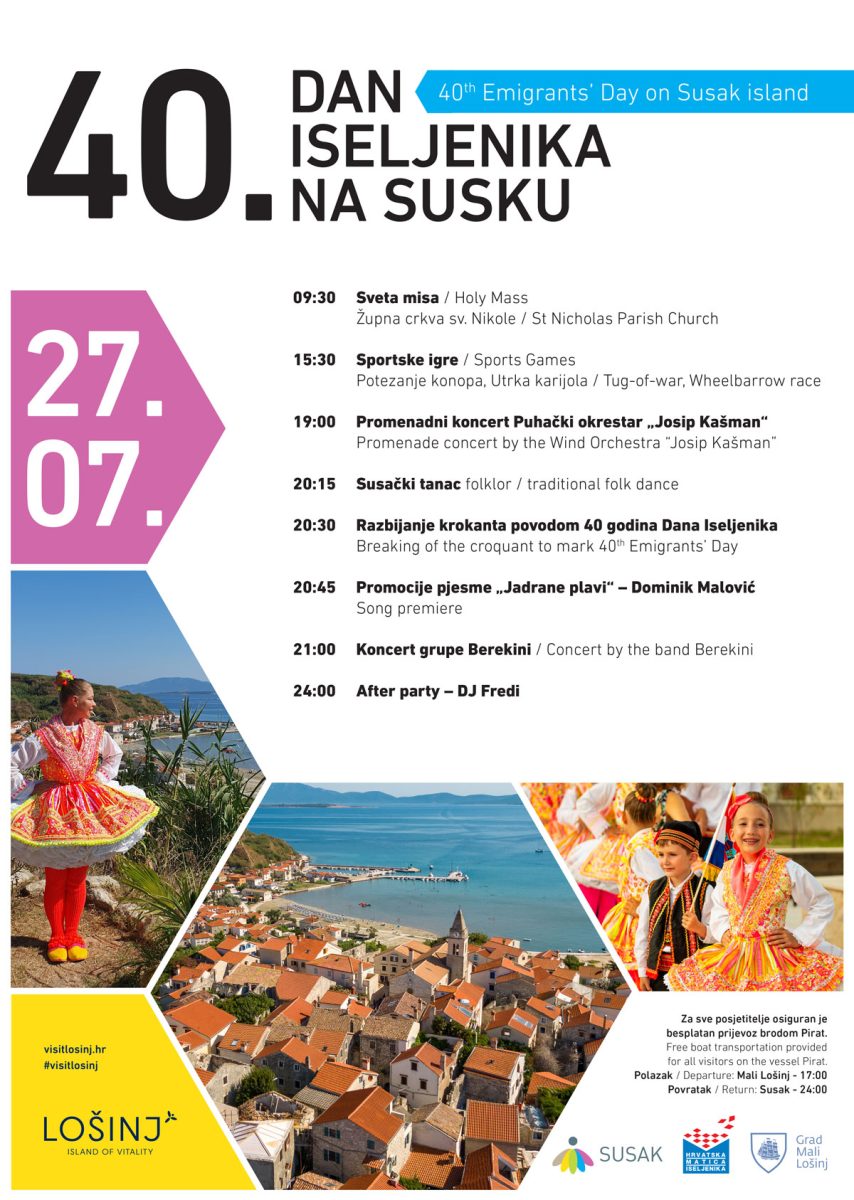 Organizatori kulturno zabavnog programa obilježavanja Dana Iseljenika su Grad Mali Lošinj, Hrvatska matica iseljenika- podružnica Rijeka, Mjesni odbor Susak te Turistička zajednica Grada Malog Lošinja.