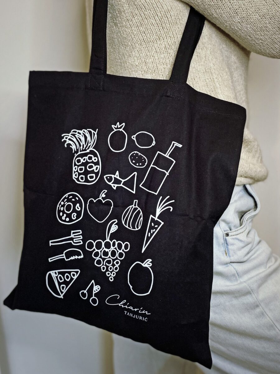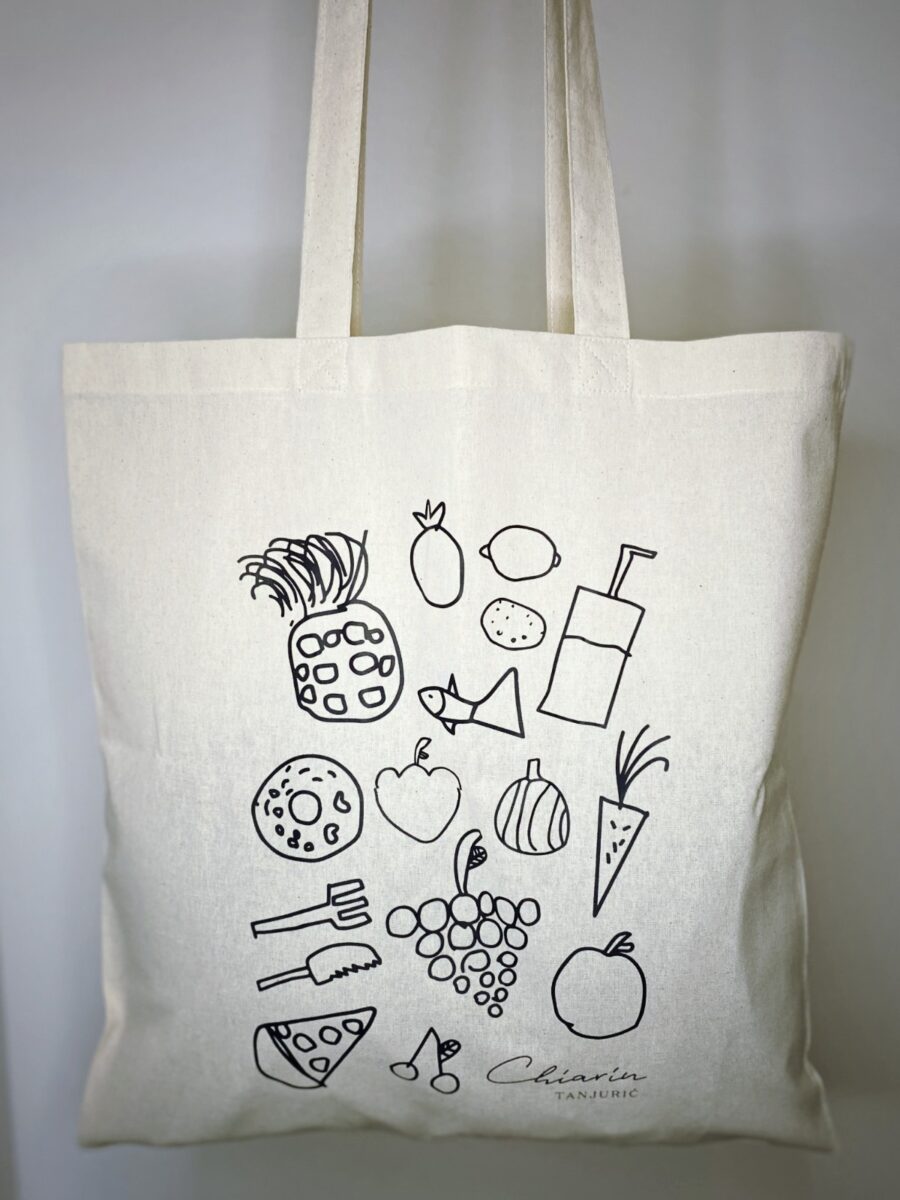 Osim pregača, kreativni dvojac u svojoj ponudi od sada nudi i platnene vrećice u dvije boje sa zanimljivim dizajnom kojeg je oslikala Nastasjina kći Gaia. Ove razigrane vrećice, spoj su svega što brend Chiarin tanjurić predstavlja, a to je zabavno kuhanje raznovrsne i šarene hrane za cijelu obitelj s naglaskom na sezonalnost i svježinu.
