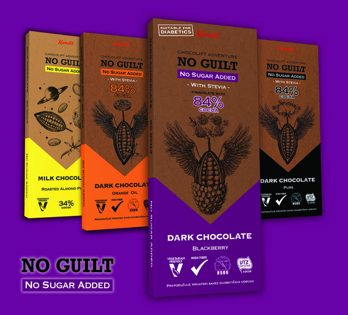 Cijela linija Kandit No guilt čokolada s 84% kakaa kreirana je iz visokokvalitetnih sastojaka i ispunjava i najzahtjevnija očekivanja ljubitelja slatkih proizvoda. Posebno je zanimljiva svima koji vode računa o kvaliteti prehrane i o svom zdravlju, a svoju preporuku dao je i Hrvatski savez dijabetičkih udruga te ju mogu slobodno jesti i dijabetičari.