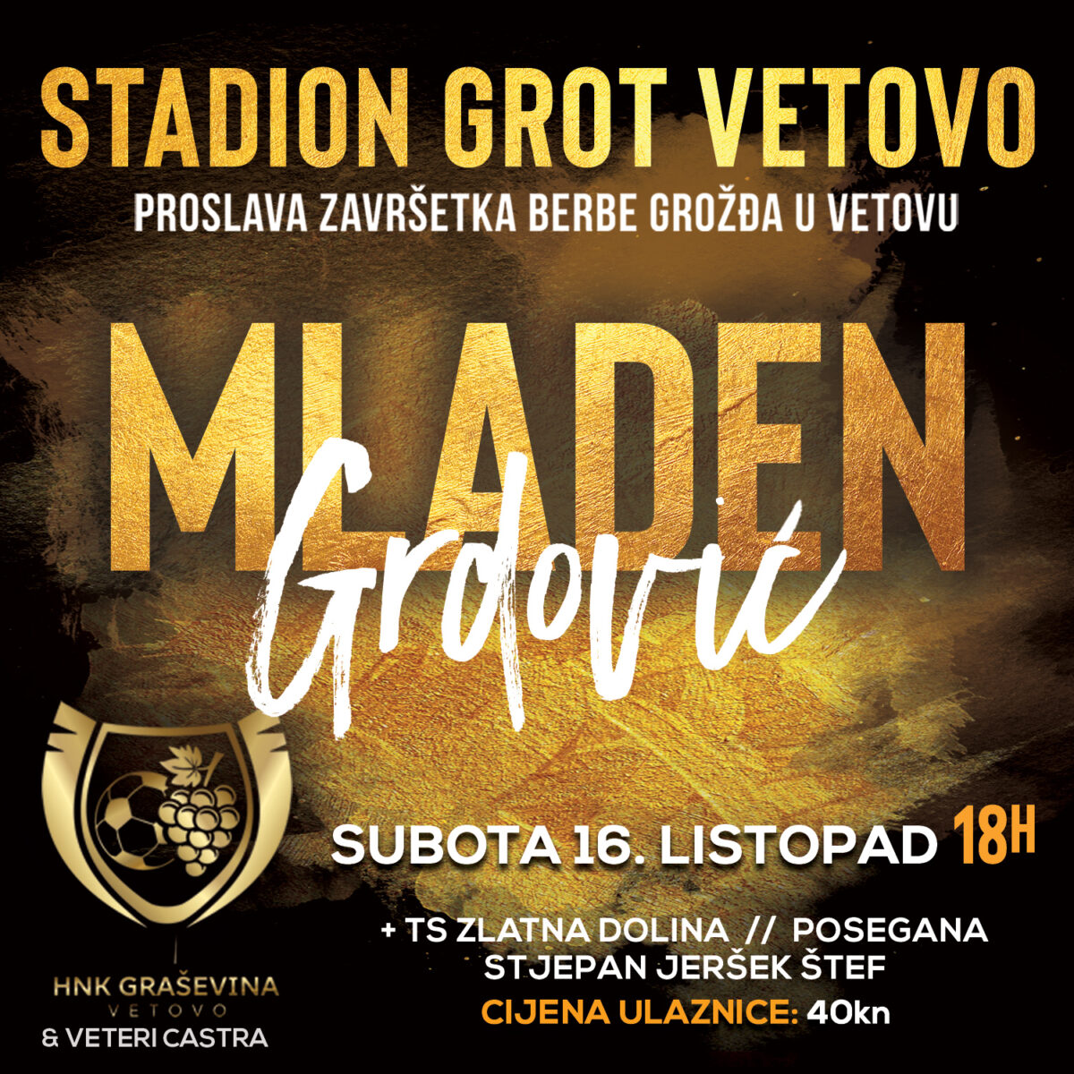 Nema tog ljubitelja nogometa koji nije čuo za HNK Graševinu, sve je poznatiji i u svijetu vina, a od kada im je Mladen Grdović snimio navijačku himnu još su popularniji. Zadarski pjevač glavna je zvijezda i na proslavi završetka berbe grožđa koja se održava na stadionu Grot Vetovo 16. listopada od 18 sati. Nigdje se kraj berbe ne slavi kao u Vetovu!