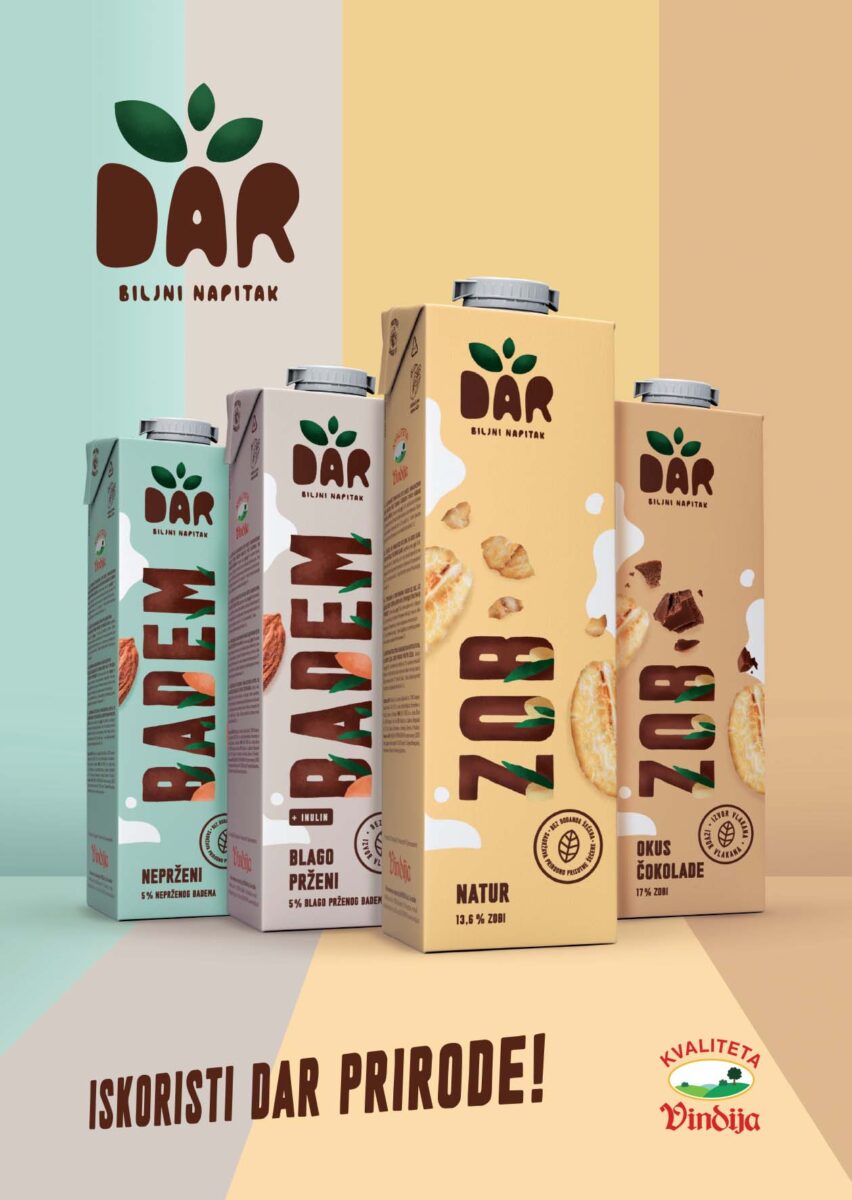 Pred sam kraj ljeta stiže nam nešto novo i dragocjeno iz Vindije, na tržište su izašli novi napitci jedinstvenih receptura, 100 % biljnog podrijetla. DAR napitci od zobi i badema oduševit će vas svojim sastavom, izgledom i pakiranjem, a prije svega vrhunskim izbalansiranim okusima. Dolaze u četiri zamamna okusa: Zob Natur, Zob okus čokolade, Badem neprženi i Badem blago prženi, a nose znanstveni žig “Živjeti zdravo” i garantiraju zdravstvenu ispravnost, ali i kvalitetu u skladu s propisanim kriterijima zbog čega pozitivno utječu na naše zdravlje i kvalitetu života.