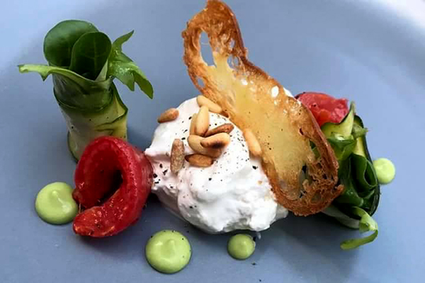 burrata, marinirana tikvica, confit od rajčice….