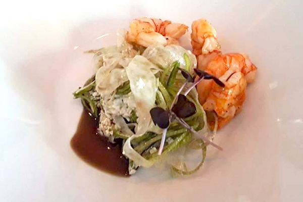 kozice na salati od koromača i poriluka, feta sir i kavijar od meda