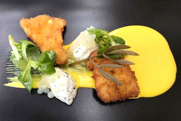 panirani bakalar, kozji sir, aioli, kavijar od limuna