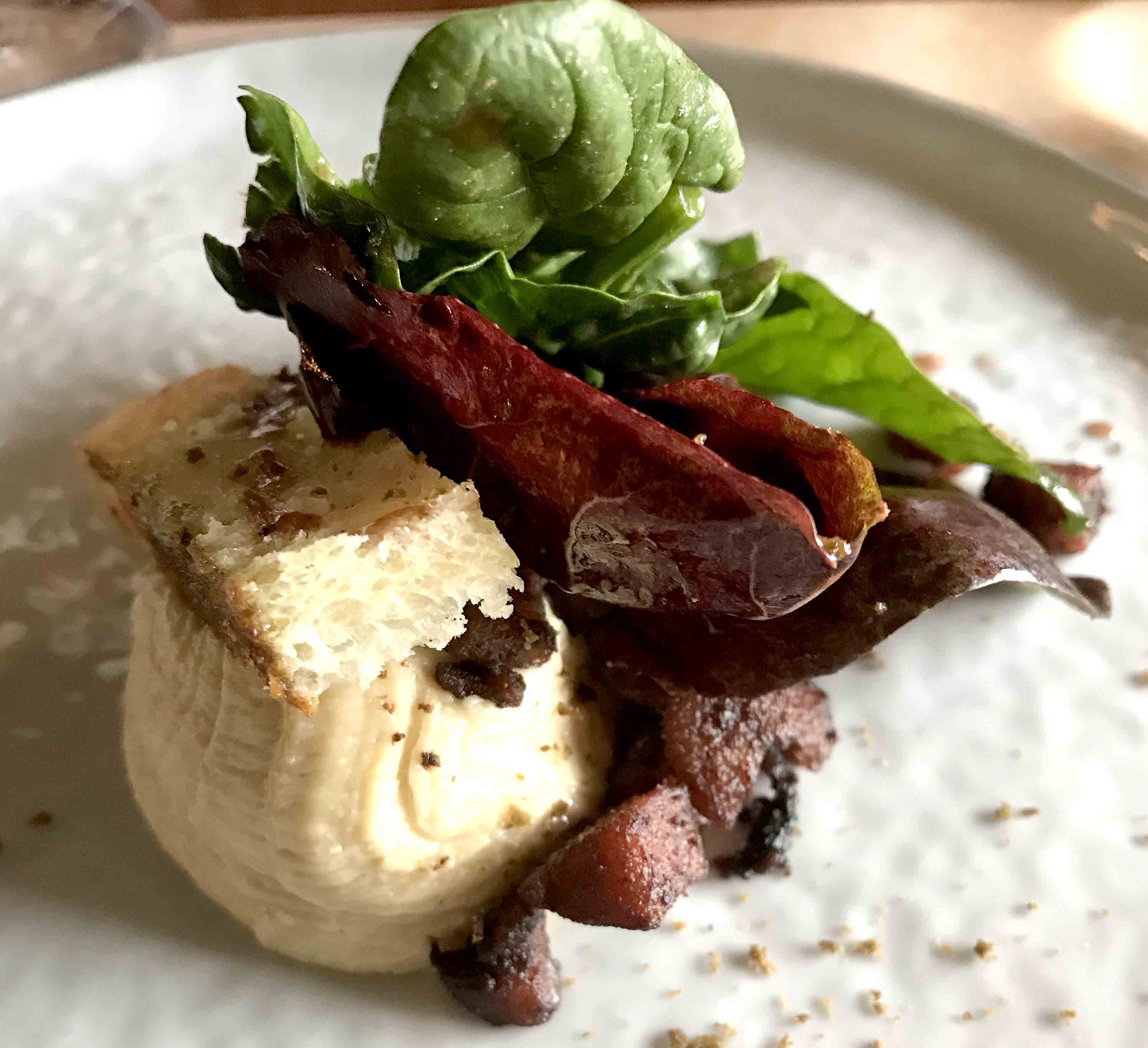 Pačji confit, pjenast i nježan u teksturi ali močan okusom, malo zakiseljeni čvarci i salatica, efektno ali močno, jedva sam to sve smazal.