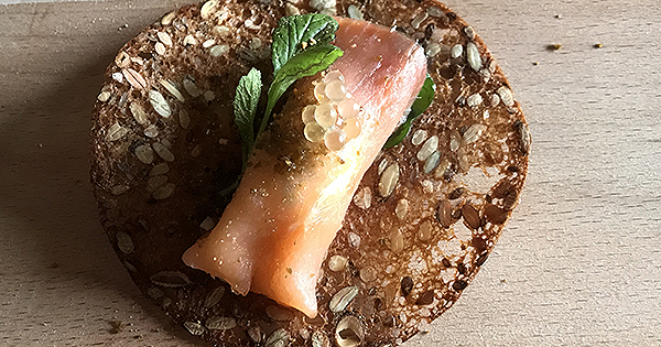 Počelo je finim pozdravom iz kuhinje, tostirana šnitica punozrnatog kruha,dimljeni losos punjen dosta intenzivnim kozjim sirom i malo “kavijara” od grejpa za laganu citričnu notu….fino!