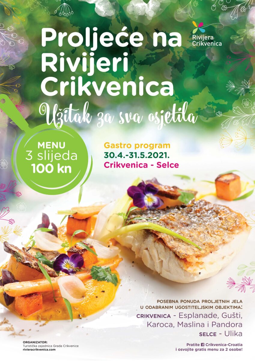 slijeda za 100 kn po osobi. Tema su, naravno, proljetne namirnice, a kušati možete jela poput Ceviche od jadranskog škampa i kozica, Carpaccio od jadranske tune s kremom od šparoga, Medaljoni od grdobine na gregadu, Rolani file orade u umaku od začinskog bilja i domaćih šparoga, Pileća rolada panirana u sezamu, punjena divljim šparogama i mozzarellom, Panna cotta s coulisom od jagoda ili neizostavna crikvenička slastica – Frankopan torta. Svakako redovito pratite i Facebook stranicu Crikvenica – Croatia jer su u pripremi neka slatka iznenađenja.