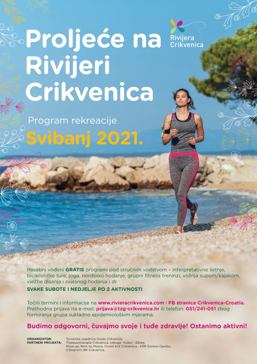 Proljetni će vikendi u svibnju biti rezervirani i za organizirane nenaplatne rekreativne aktivnosti pod vodstvom iskusnih trenera, kao što su: grupni fitness trening, joga, vođene vožnje biciklima (mogući i ebicikli), biciklijade, interpretacijske šetnje, vožnja supom ili kajakom, nordijsko hodanje isl. Sve će se aktivnosti provoditi na otvorenom, ovisno o aktualnim epidemiološkim uvjetima i mjerama, a u slučaju nepovoljnih vremenskih uvjeta bit će otkazane. Detaljan popis aktivnosti po terminima i lokacijama možete pronaći na www.rivieracrikvenica.com ili na Facebook stranici Crikvenica-Croatia. Za sudjelovanje je najbitnija dobra volja i želja za druženjem i uživanjem u prirodnim ljepotama Crikvenice, Dramlja, Jadranova, Selca i zelenog zaleđa Vinodola te obavezna prijava na e-mail: prijava@tzg-crikvenice.hr ili osobno u Turističkoinformativnom centru Crikvenica (Trg Stjepana Radića 1c).