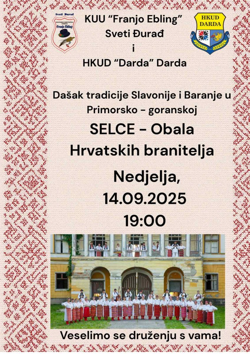 U nedjelju, s početkom u 19:00 sati u centru Selca, održat će se posebno kulturno događanje pod nazivom “Dašak tradicije Slavonije i Baranje u Primorsko–goranskoj”.