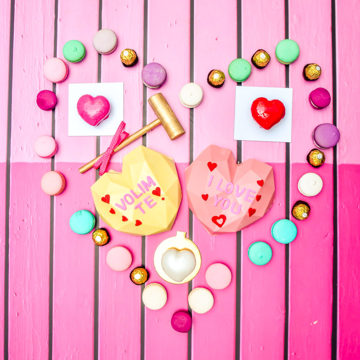 Za prave Čokoljupce predlažemo Velika čokoladna srca napravljena od crne ili bijele čokolade, punjena macaronsima, Ferrero i Raffaello kuglicama. No, da biste došli do slatkiša tortu je potrebno pretvoriti u komadiće – zato vam šaljemo i mali drveni čekić. Čuvajte prste i podijelite ljubav sa cijelom obitelji.