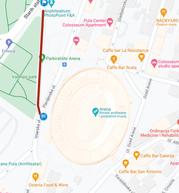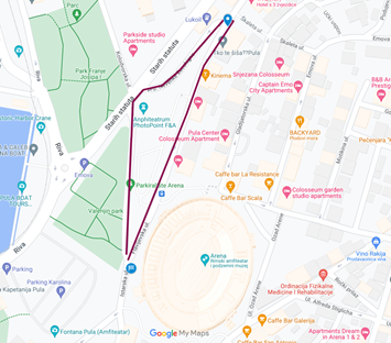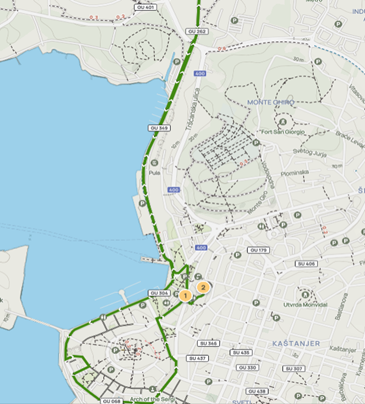 Skreće se zatim Rivom desno Ulicom 119. Brigade i Partizanskim putom uzbrdo — okret za 180° 5m prije raskrižja za skretanje za Pizzeriu Tivoli — Partizanski put — zapadni kolnik Ulicoe 119. Brigade — Riva — Flaciusova — ulazak na Forum — izlaz kroz pro. Svetog Nikole — Flaciusova — Danteov trg — Anticova — zapadni kolnik Laginjina — zapadni kolnik Giardini — Carrarina. Iz Carrarine skreću pod 90 ° desno u Amfiteatarsku — skretanje desno pod 90 ° i ulazak u Arenu — CILJ.