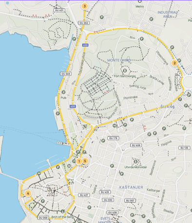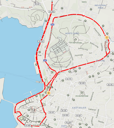 Ostatak trase je sljedeći: Tršćanska — Starih statuta — Riva — istočni kolnik Ul. Svetog Petra — Partizanski put — okret za 180° 5m prije raskrižja za skretanje za Pizzeriu Tivoli — Partizanski put — zapadni kolnik Ul. Svetog Petra — Riva — Flaciusova — ulazak na Forum — izlaz kroz pro. Svetog Nikole — Flaciusova — Danteov trg — Anticova — zapadni kolnik Laginjina — zapadni kolnik Giardini — Carrarina — skretanje desno 90° kod Gradske knjižnice — Amfiteatarska.