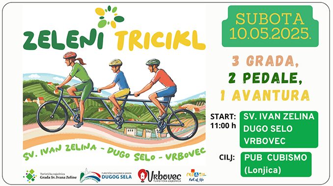 U subotu, 10. svibnja 2025. godine, na području Dugog Sela, Sv. Ivana Zeline i Vrbovca, održat će se rekreativna biciklistička vožnja Zeleni tricikl – tri grada, dvije pedale, jedna avantura. Riječ je o zajedničkoj vožnji koja na dva kotača spaja tri susjedna grada, a završava velikim druženjem na cilju. Sudionici će moći odabrati jednu od tri startne točke — ŠRC Sv. Ivan Zelina, NK Vrbovec ili Martin breg u Dugom Selu, a cilj svih ruta je Pub Cubismo u Lonjici, gdje će ih dočekati zajedničko druženje uz glazbu, ukusne zalogaje i dobru atmosferu.