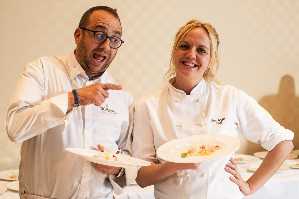 S Anom Grgić, prvom damom Esplanadine kuhinje i njenim timom kuhara ovaj šarmantni Francuz pripremao je tradicionalnu šampanjsku gala večeru u restoranu Zinfandel’s. Raskošnim jelovnikom od pet sljedova pomno odabranih francuskih delicija, od kojih se posebno isticao njegov prepoznatljivi milkshake bouille-abaisse, oduševio je Zagrepčane i uzvanike hotela. Chef je za menu odabrao primamljive mediteranske okuse koje je pripremio u svojem jedinstvenom stilu, poput gravlaxa od brancina sa zvjezdastim anisom uz salatu od komorača i limuna, zanimljive zaleđene juhe od češnjaka, zatim goveđih obraza u začinu Raz el Hanout s humusom i krostinima od moždine te primamljivog francuskog tarta od limuna uz osvježavajući sorbet od limete i bosiljka. Sljedovi jela pomno su popraćeni selekcijom vrhunskih francuskih šampanjaca Veuve Clicquot i Moët & Chandon, dok su uz glavno jelo uzvanici imali priliku kušati jedinstveno francusko vino Malbec iz vinarije princa Henrika od Danske, koji je prije dvije godine s kraljicom Margaretom II. prilikom službenog posjeta Hrvatskoj boravio u Esplanadi.