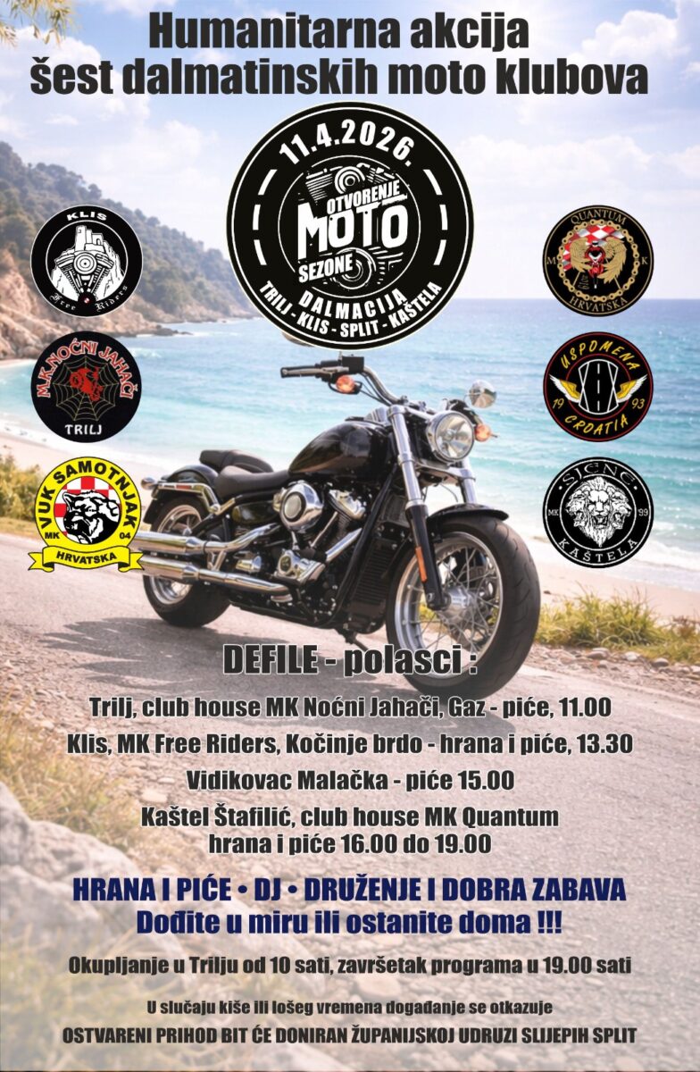 Defile bajkera od Trilja do Kaštela drugog vikenda u travnju već je postao tradicija. I ove subote, 11. travnja, motori u srcu Dalmacije zagrmjet će s istim ciljem – otvara se nova moto sezona i pomaže se onima kojima je potrebno.