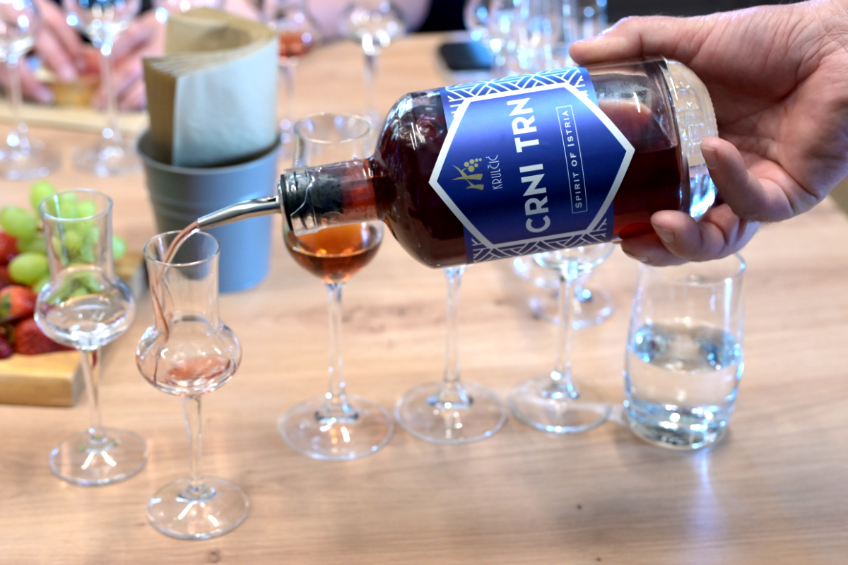 Danas proizvode 13 etiketa, a sve kreće od komovice kao baze. Proces je precizan i podijeljen u tri faze – od otkupa dropa, fermentacije do destilacije u vlastoručno izrađenim kotlovima. Degustacija uključuje niz autentičnih okusa – od Rakije od muškata, preko Crnog trna i Kadulje, divnog Amara di Oliva, do aromatičnog Teranina. No osim okusa, ono što ostavlja dojam je prostor – moderna kušaonica s velikim kotlom u središtu koja jasno daje do znanja da je riječ o ozbiljnoj proizvodnji.
