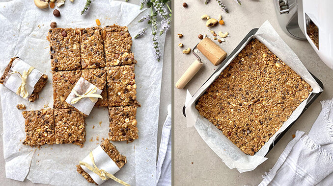 Slatku, a zdravu smjesu stavite u pleh obložen masnim papirom, poravnajte ju i dobro utisnite žlicom, čašom ili valjkom. Sve odložite u hladnjak na minimalno pola sata, a zatim gotove pločice izrežite na željene oblike. Trud je minimalan, a djeca će obožavati rezultat. Pločice možete omotati u papir za pečenje i spremiti ih djeci za užinu u parku, vrtiću ili školi. Par komadića svakako ostavite i za sebe – za pauzu između sastanaka, kada vam padne razina energije. 😊